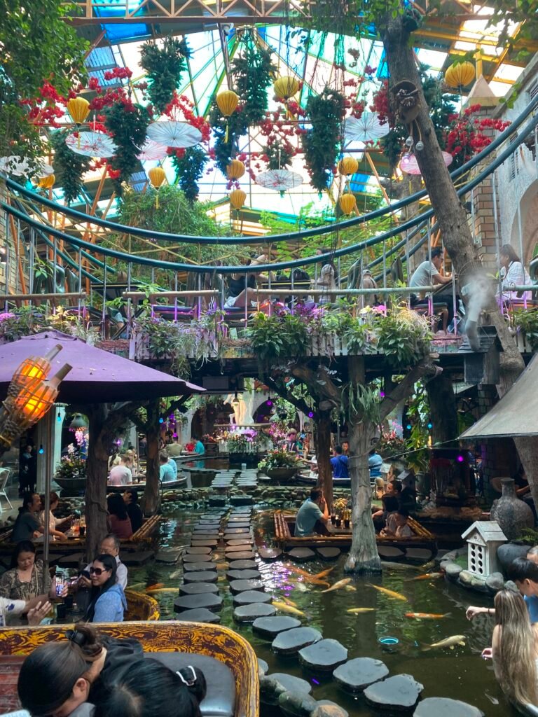 The real highlight of this place is the flourishing plant decor and giant koi pond.